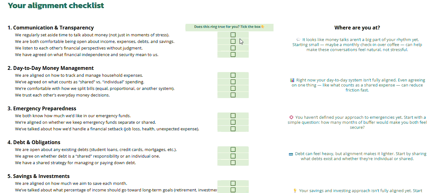 That’s where the Wealthbit Alignment Checklist comes in. It’s a practical, guided tool to help you and your partner get on the same page about money.